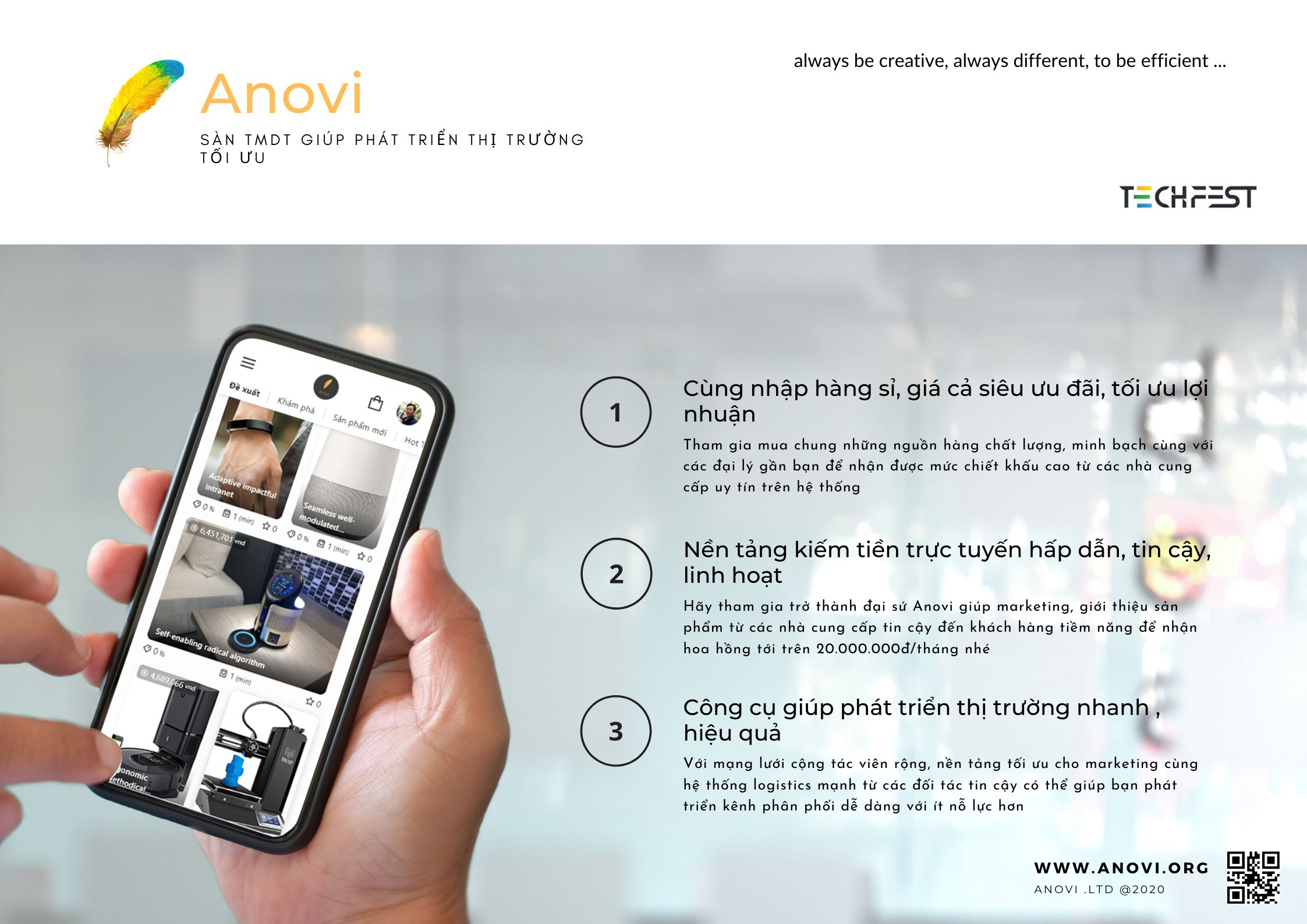 Anovi is a specialized e-commerce platform for businesses Adopt the general buying mechanism Retailers can optimize profits from gathering wholesale orders with other dealers nearby, to enjoy high discounts from suppliers to stimulate demand, encourage customers to introduce goods to more potential customers. At the same time with the supplier. Anovi can help reduce operating costs, logistics, and inventory rates by clustering buyers to optimize routes, vehicles, and warehouses. Along with that is a mechanism that helps passive marketing providers with zero costs through a system of free sale / marketing collaborators to make money on the platform from introducing goods to potential retailers.